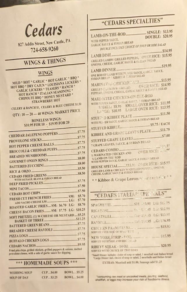 Menu and prices subject to change. Contact +1 724-658-9260 for confirmation.
