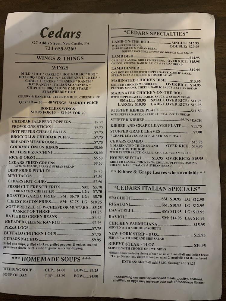 Cedars' menu marries tradition with creativity. The offerings range from hearty sandwiches to delectable appetizers. Highlights include the renowned Pittsburgh sandwich, made with fresh, tender ingredients. Wings come in various flavors, satisfying diverse tastes. Each dish emphasizes quality and freshness, showcasing local flavors.